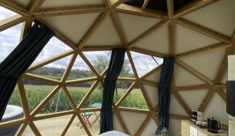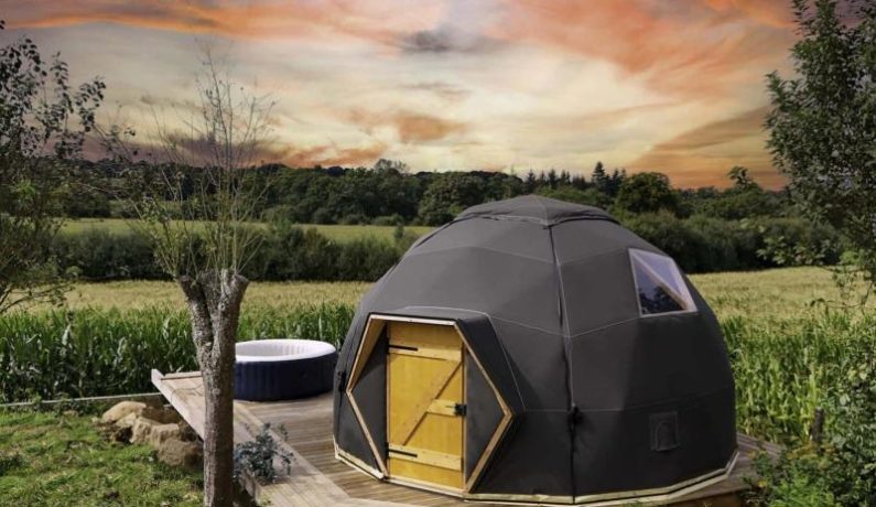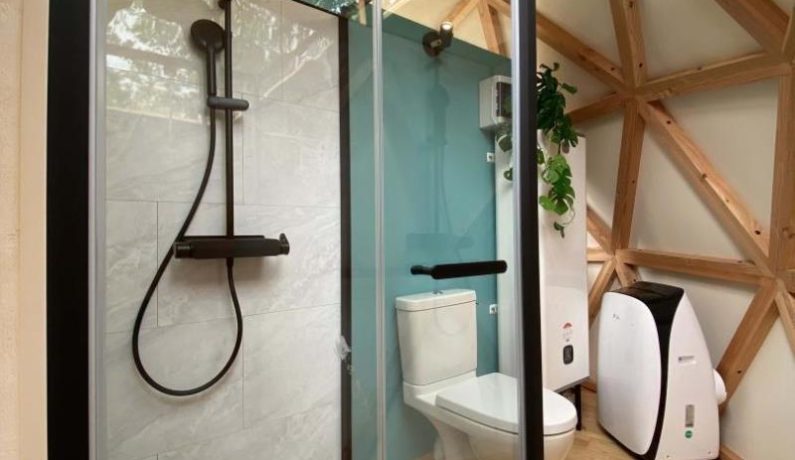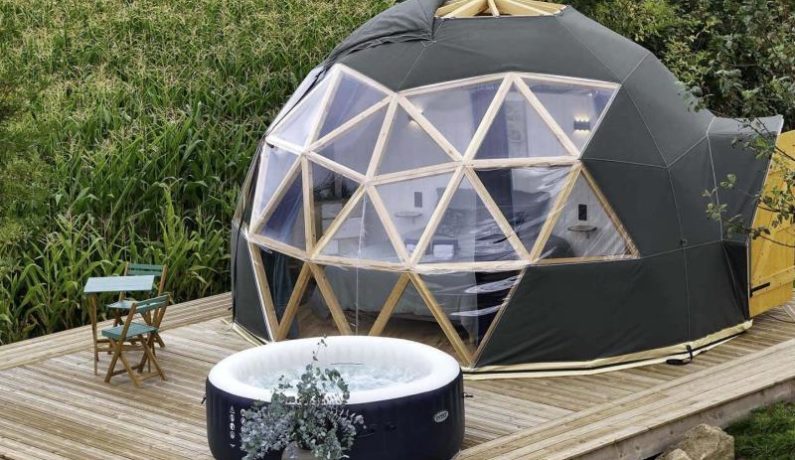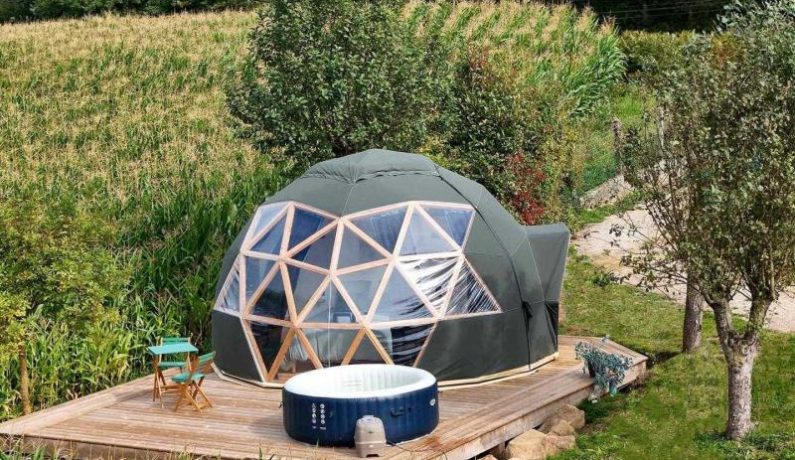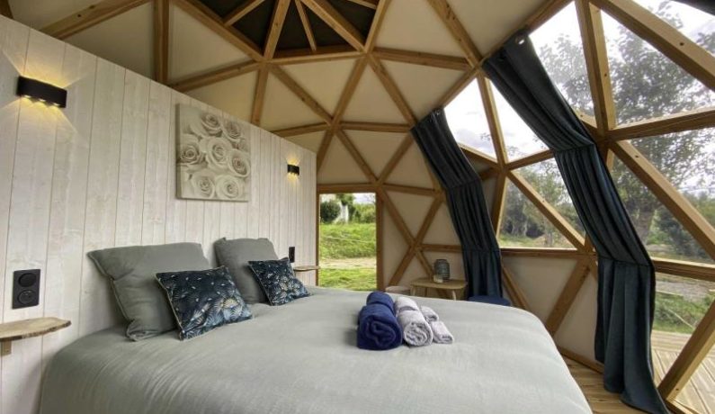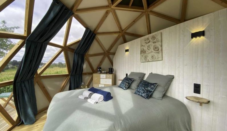 Dôme insolite à ossature bois de 20 m², en toile et isolé en laine : lit 2 personnes 160 x 200 cm, bouilloire et machine à café, lit bébé sur demande, lavabo, cabine de douche et wc. Terrasse en bois surélevée avec spa spa fermé du 1er novembre au 1er avril. Réseau 4G. Chauffage par climatisation réversible. Formule tout inclus avec draps, linge de toilette et petit déjeuner. Table d’hôtes en option uniquement sur demande. Jardin commun des propriétaires partiellement clos, avec très gentil et très discret chien de race Golden Retriever.