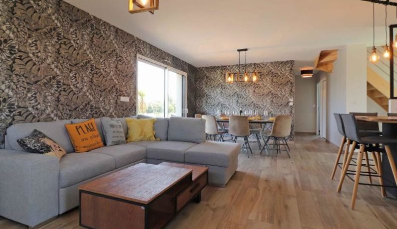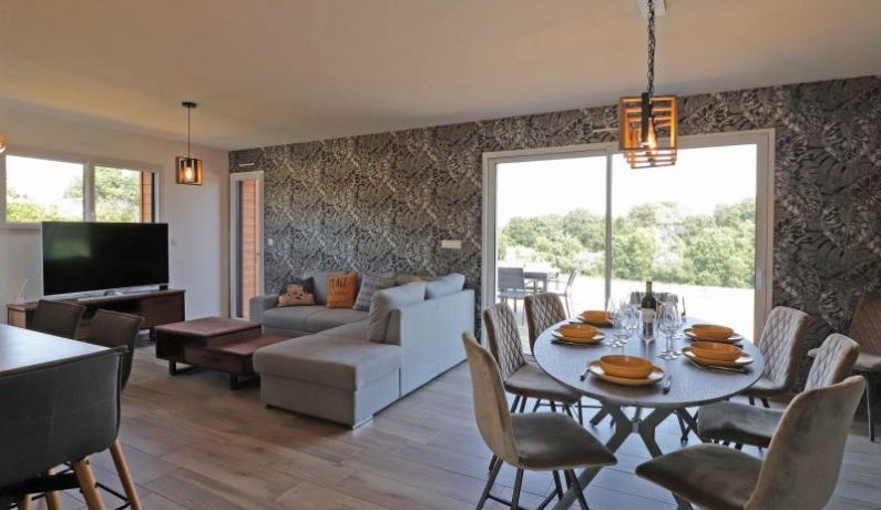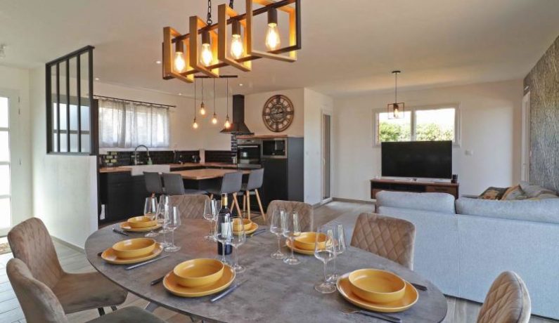 Maison récente indépendante avec chauffage par pompe à chaleur, en formule tout compris. – Rez de chaussée : séjour avec salon (TV avec abonnement Netflix) et cuisine ouverte entièrement équipée (cafetière Senséo), salle d’eau (double vasque et douche), wc indépendant avec lave-main, salon bibliothèque, buanderie avec lave-linge et sèche-linge. – Etage : chambre (lit fait 2 personnes 160 x 200 cm), chambre (lit fait 2 personnes 160 x 200 cm), chambre (2 lits faits 1 personne 90 x 200 cm), wc indépendant avec lave-main. Jardin clos 3 500 m² avec piscine extérieure 5 x 10 mètres, équipée d’une bâche amovible sécurisée et solaire, chauffée de mi-avril à fin octobre.