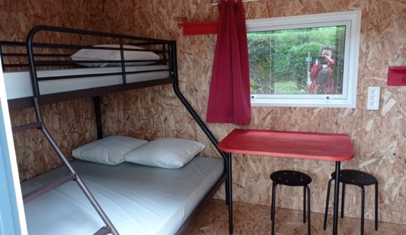 L’aménagement des deux cabanes comprend : Un lit double, un lit simple superposé, une tablette + tabourets, Électricité, Place pour rentrer son vélo.