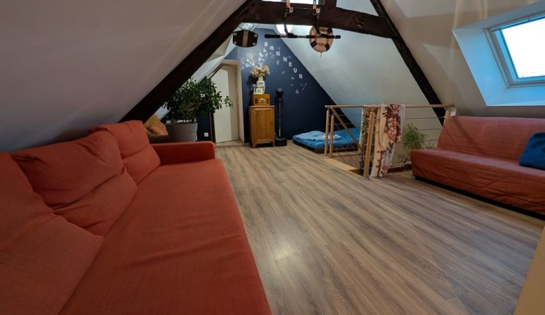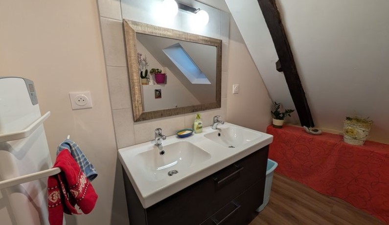 La chambre, située au premier étage, comprend un lit double et un lit simple. Une salle de bain ainsi que des WC réservés aux hôtes se trouvent sur le palier. Une cuisine est également à votre disposition pour un séjour en toute autonomie.